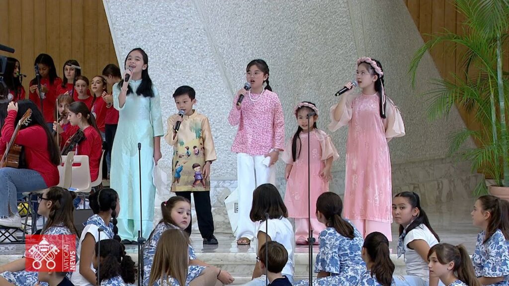 Khi Đức Thánh Cha bước ra hội trường Phaolô VI, cả hội trường vang lên chào mừng ngài. Trong lời chào các em, Đức Thánh Cha đã cảm ơn các trẻ em từ khắp nơi trên thế giới đã đến. Ngài cũng nói với các em về món quà đặc biệt là sự sống và được ở bên nhau. Bởi vì hiện tại, nhiều trẻ em ở trong các vùng chiến tranh, các em không được vui cười. Đức Thánh Cha cũng nhắc đến ngôi nhà thế giới rộng lớn, mà dù ở đâu, các em cũng cần được chào đón như ở nhà.