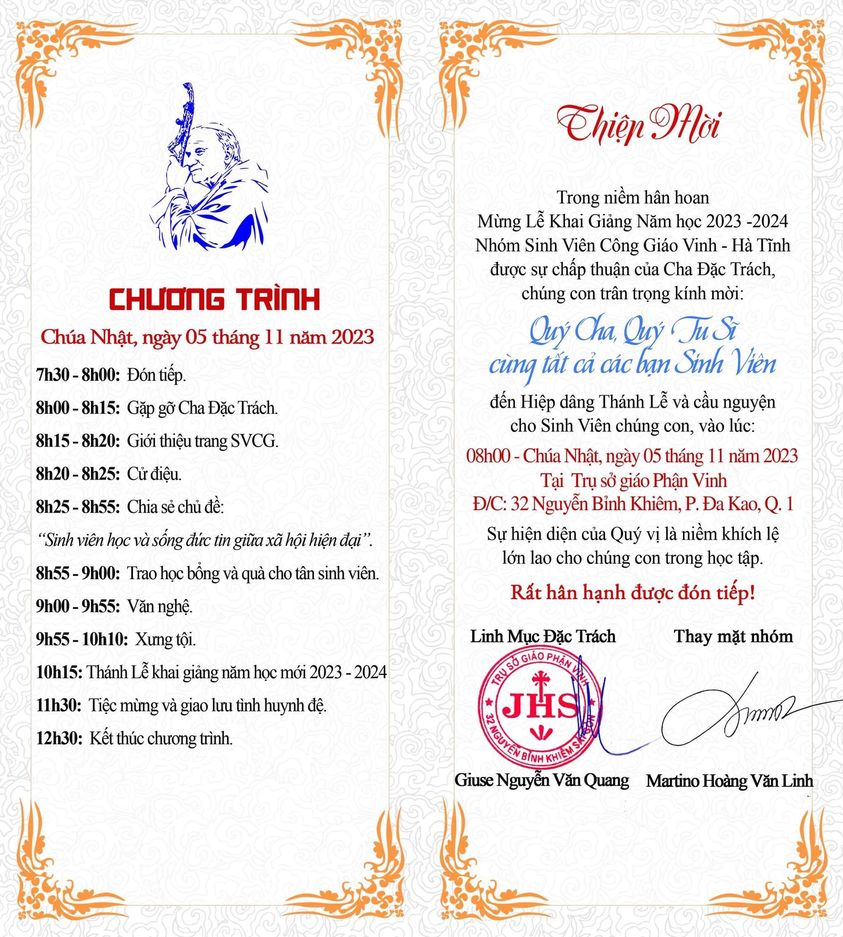 Nhằm chuẩn bị tốt nhất cho năm học mới và quy tụ con cái hai giáo phận nhân dịp đầu năm, Ban Đại diện SVCG Vinh – Hà Tĩnh tại Miền Nam thông báo về lễ khai giảng năm học mới 2023-2024 và kêu gọi sự tham gia của tất cả các bạn sinh viên thuộc hai giáo phận. Đây là một cơ hội đặc biệt để chúng ta gặp gỡ, giao lưu, và cùng nhau chuẩn bị cho một năm học thành công.
