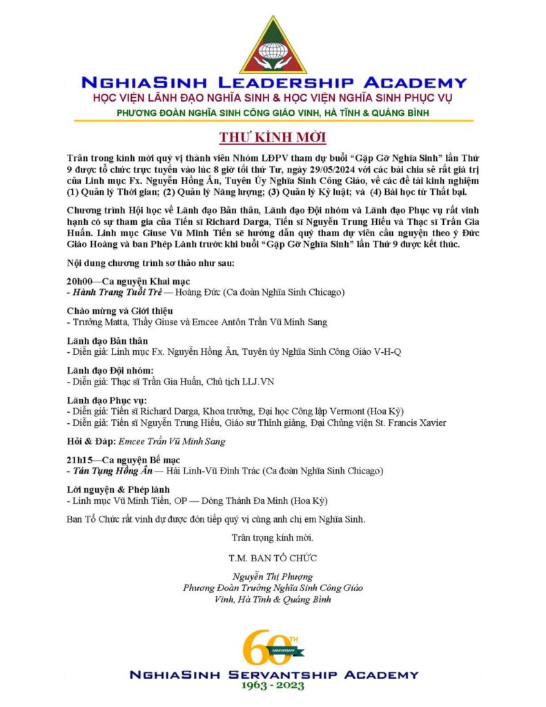 Thư mời tham dự buổi gặp gỡ Nghĩa Sinh lần thứ 9 (29/5/2024) Trần Đức Hà 9 giờ trước Download [344.83 KB]